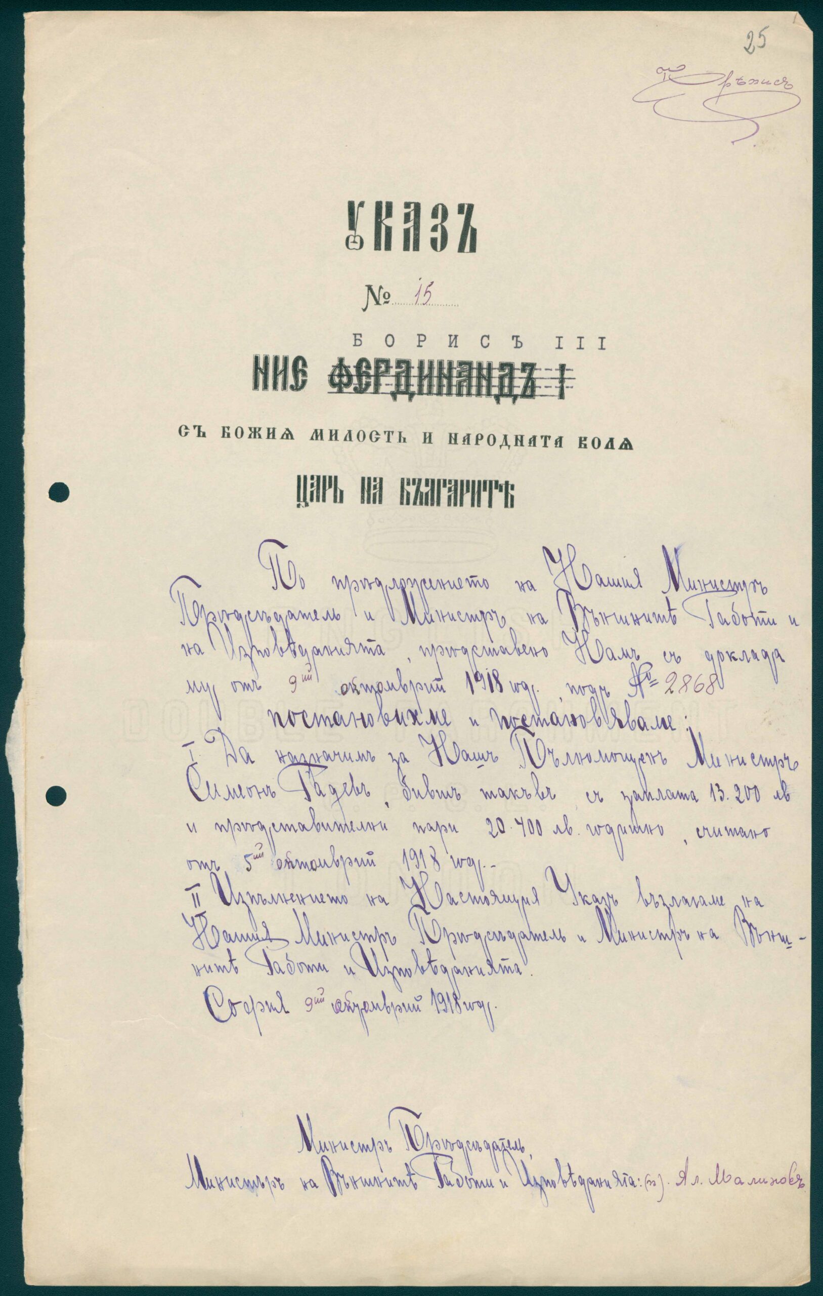 Указ за назначаването на Симеон Радев за пълномощен министър. София, 9 октомври 1918 г. ЦДА, ф. 176К, оп. 18, а.е. 823, л. 25